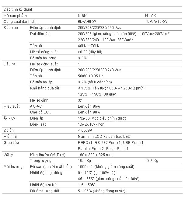 UPS Amplon nhóm N 6-10kVA là dòng UPS on-line 1pha với công nghệ tiên phong cho hệ số công suất đầu ra bằng 1 và hiệu suất AC-AC lên đến 95%. Kích thước nhỏ gọn đáng kể, tiết kiệm diện tích cho các ứng dụng quan trọng khác như bàn làm việc, POS, ATM, ứng dụng văn phòng, phòng dữ liệu nhỏ, và thiết bị sản xuất. Đặc tính vượt trội của UPS nhóm N bao gồm chức năng kết nối song song dự phòng N+X và khả năng quản lý tốc độ quạt biến thiên đảm bảo tính sẵn sàng cao và tổng chi phí đầu tư (TCO) thấp.